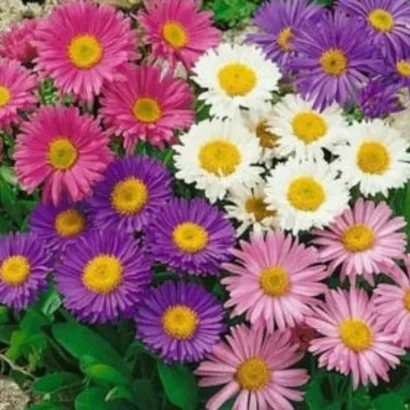 Aster Formula Mixed is a vibrant and colorful flowering plant variety that produces a mix of bright, daisy-like flowers in various shades such as pink, purple, white, and blue.