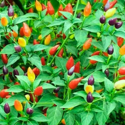 Produces bright, multi-colored, mixed ornamental chillies (red, yellow, orange, purple) with mild-to-medium pungency and decorative appeal