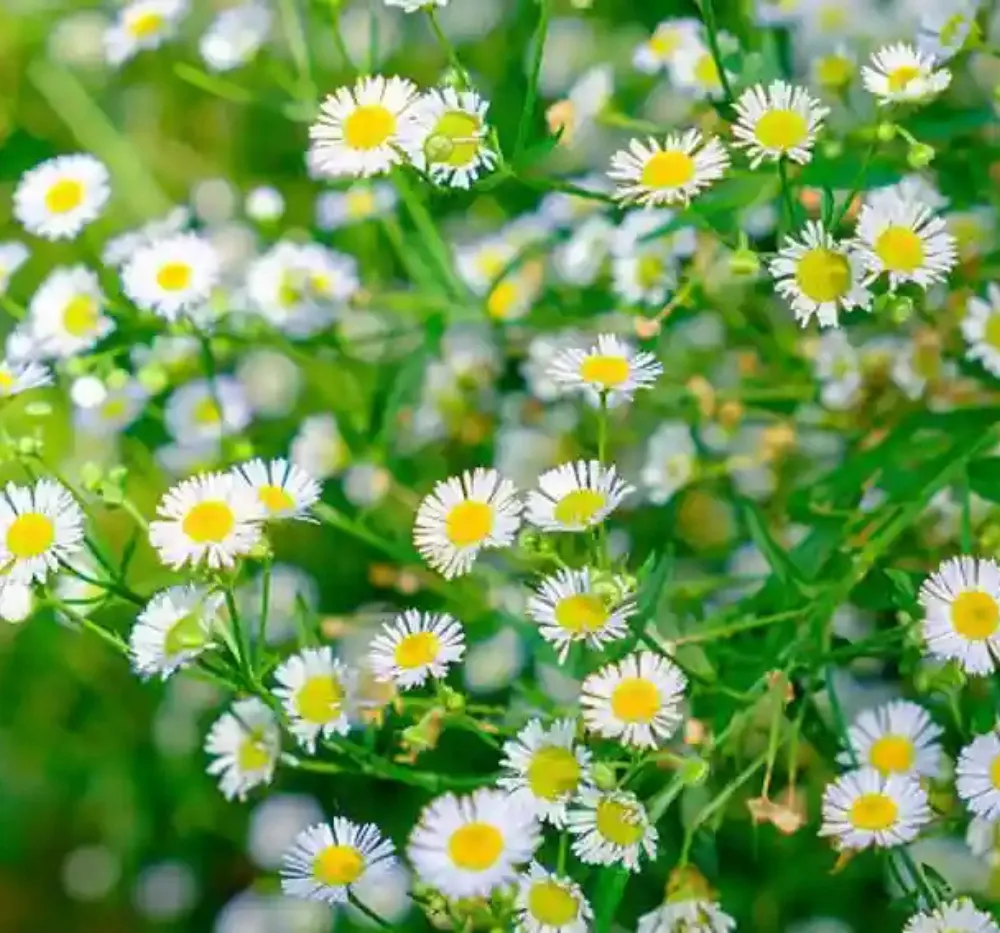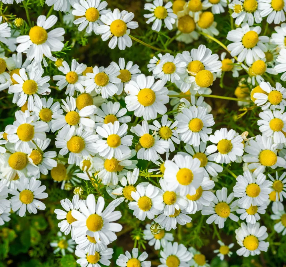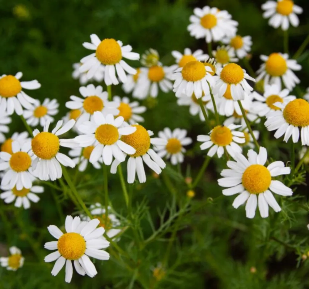 German Chamomile is a fragrant, annual herb known for its small, daisy-like white flowers with yellow centers.