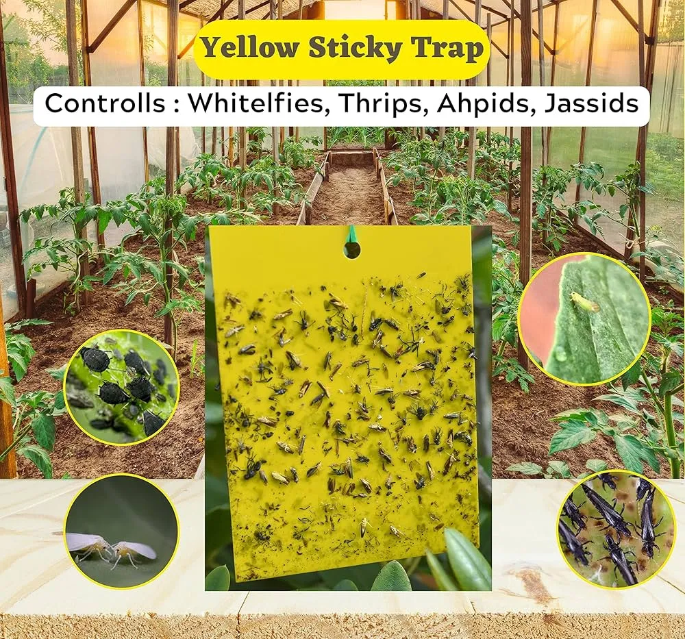 Yellow Sticky Trap for Insects – non-toxic, eco-friendly glue traps designed to catch whiteflies, aphids, thrips, fungus gnats, and other flying pests. Ideal for gardens, terrace gardens, nurseries, and farms. Powerful adhesive, weatherproof, and long-lasting.
